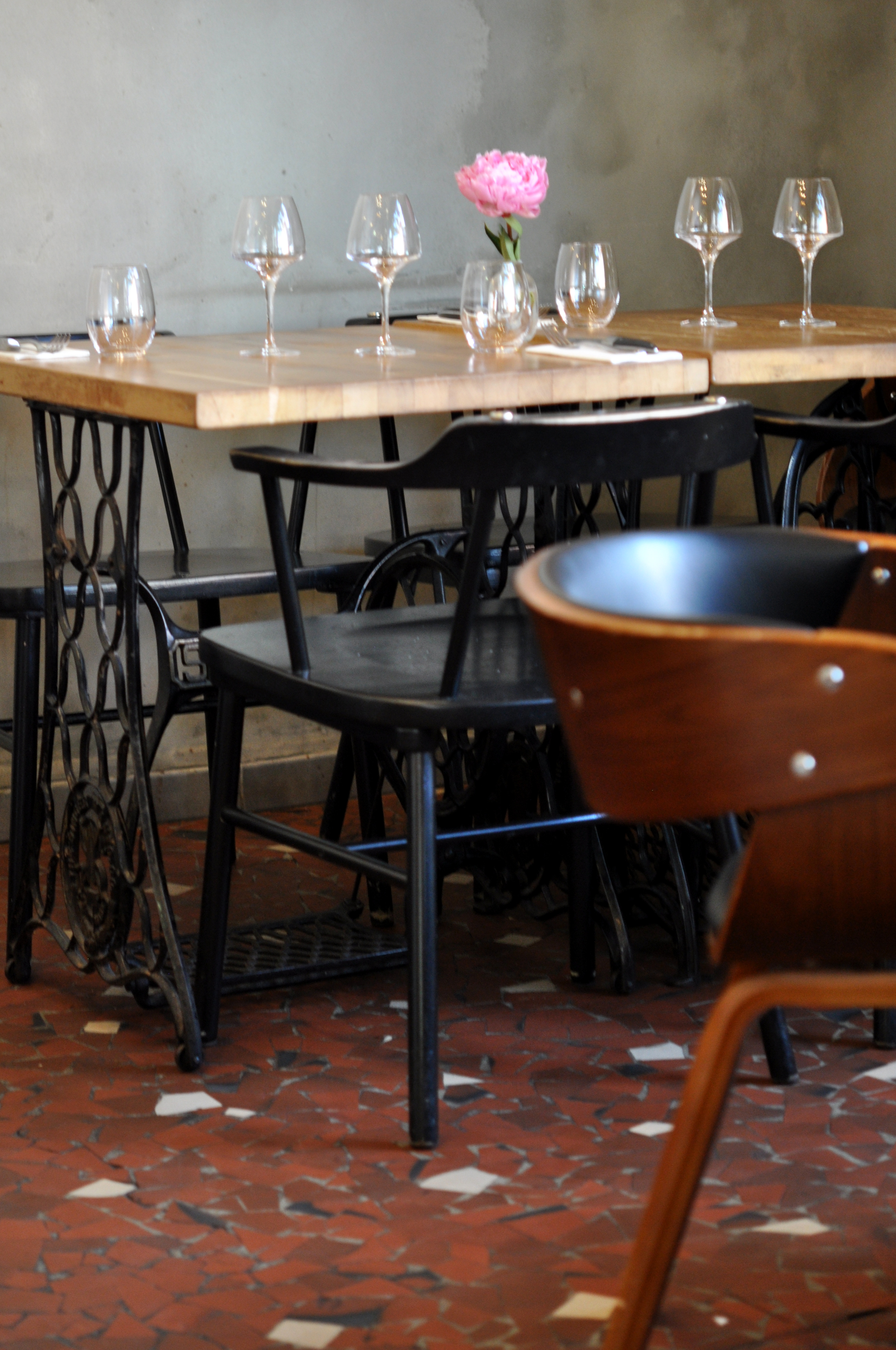 Dans cet élégant lieu empreint de minimalisme se mêlent avec harmonie meubles de menuiserie et pièces de créateurs contemporains, allant du mobilier aux céramiques. Dans les deux salles qui composent L’Etabli, un intrigant meuble d’ébéniste revisité pour s’y attabler ainsi qu’un comptoir bleu dans la lumineuse salle d’angle. Dans la seconde, une cargaison de bouteilles suspendues tout de bleu électrique revêtues.