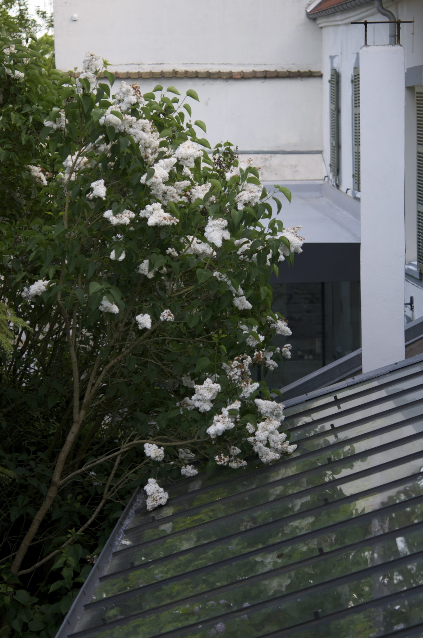 Dans le jardin d’hiver où la vigne s’épanouit trône une hotte d’acier brut dans une niche à feu en béton maçonné d’un blanc immaculé.