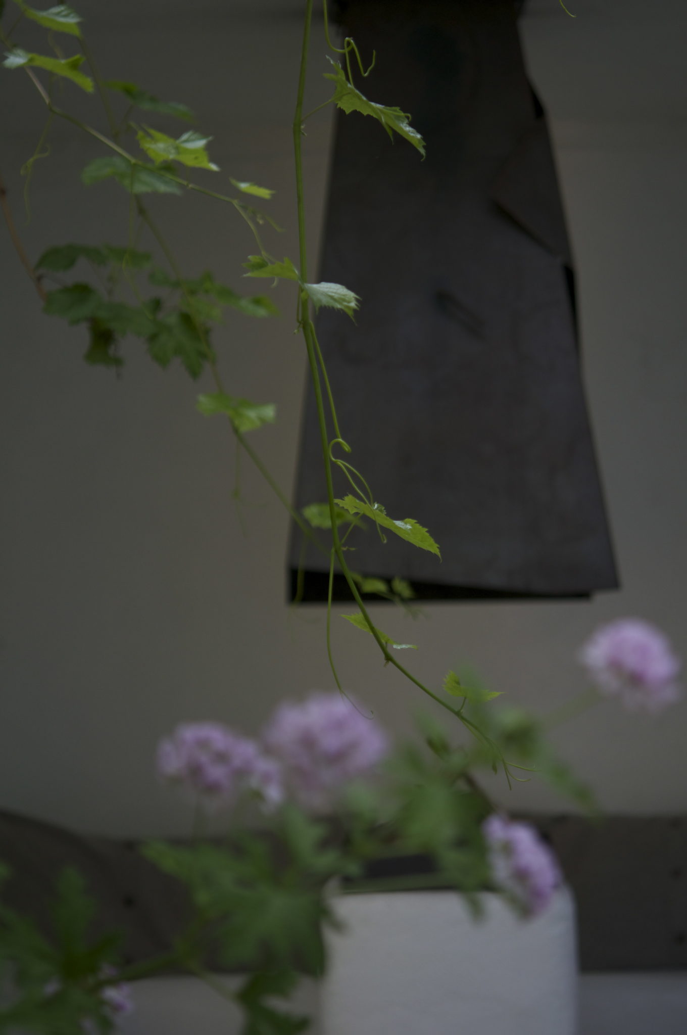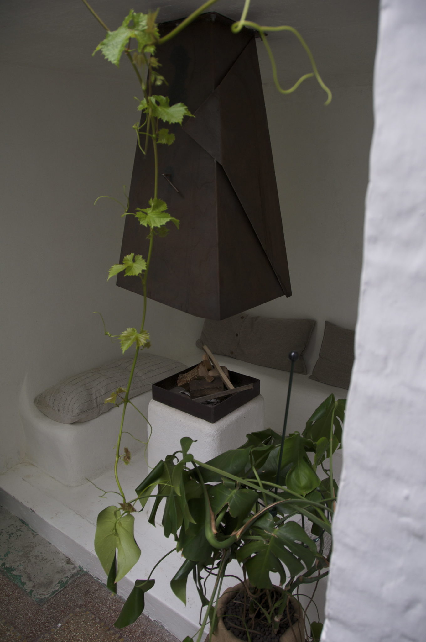 Dans le jardin d’hiver où la vigne s’épanouit trône une hotte d’acier brut dans une niche à feu en béton maçonné d’un blanc immaculé.