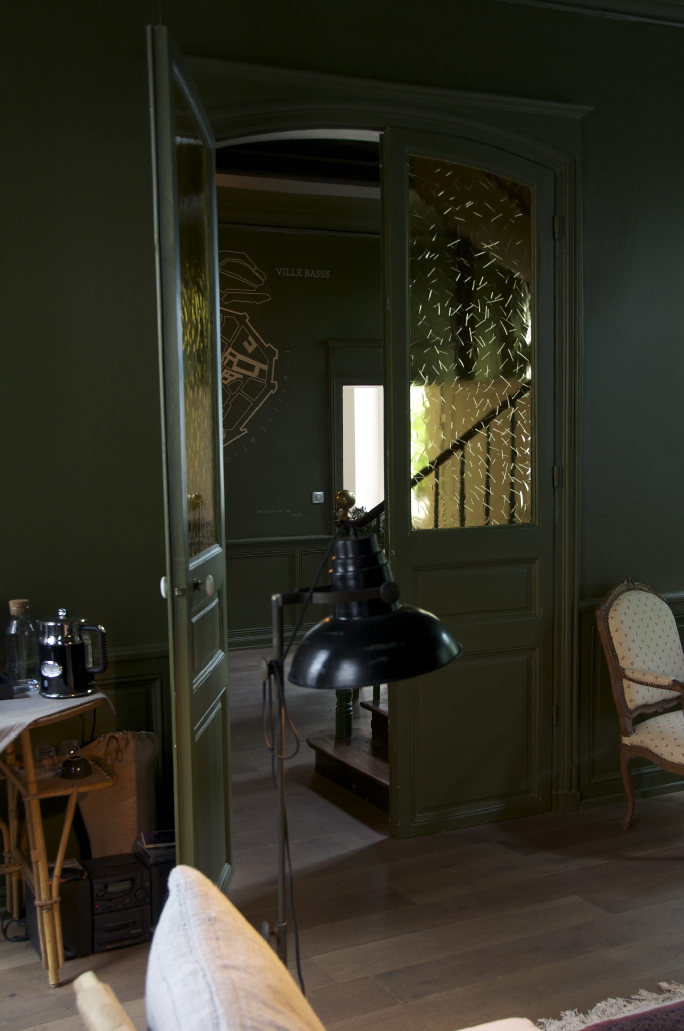 Dans la réception parquetée aux murs et plafond tout de vert recouverts est peint un plan de la ville réalisé à la main par le peintre en lettres Maksigns. Les murs du vestibule et du haut de l’escalier qui monte aux chambres ont conservé leur ancien papier à fleurs. Le salon à la cheminée d’origine se fait lui l’écrin d’un tableau de Jan Lavezzari représentant un bateau échoué dans la baie d’Authie dont les tonalités ont inspiré toutes celles de la maisonnée. Vous pourrez vous y prélasser dès votre arrivée avec en guise de bienvenue une limonade maison ainsi que des sablés aux baies de genévrier.