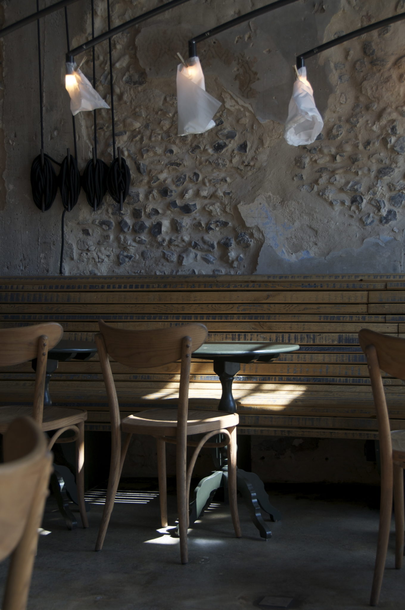 Confiée à Julie Barrau, la décoration de la salle au sol orange, faite de tables et chaises chinées et d’un vaisselier réalisé par l’Atelier Colette Doré, atelier local de restauration et création de mobilier habitent avec sobriété le lieu.