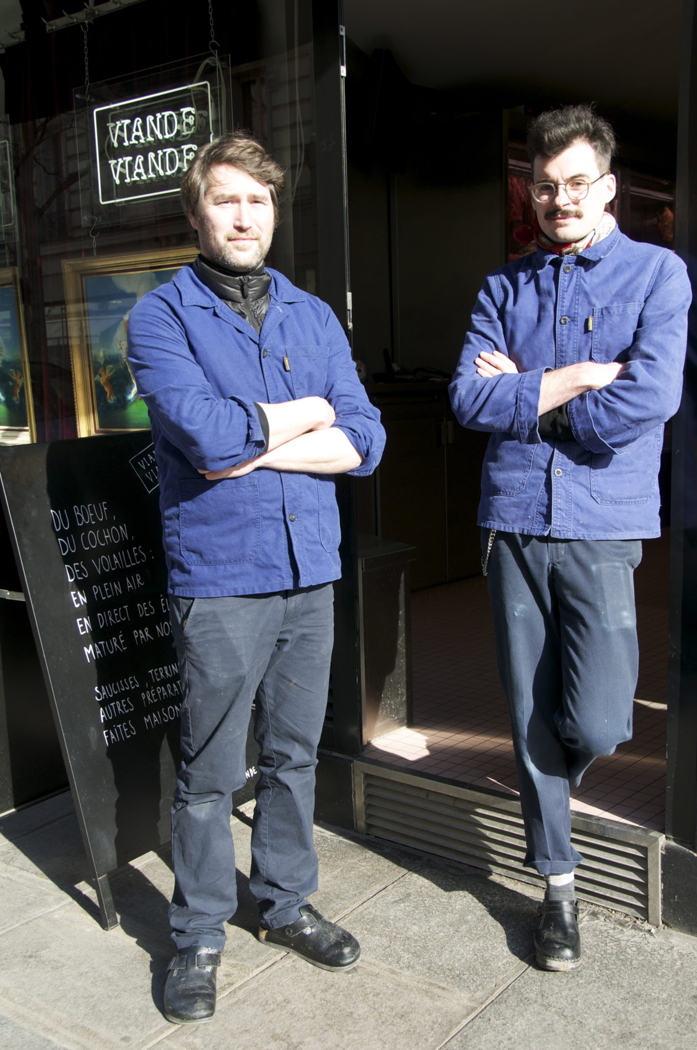 Derrière Viande Viande, Edouard Haguet et Adrien Quennepoix. L’un financier, l’autre architecte, tous deux reconvertis en artisans bouchers bien décidés à faire mener joyeuse vie aux parigots qui ont les crocs avec une sélection de viandes de bœufs, de cochons et de volailles fermiers reflétant leur engagement pour des pratiques vertueuses. De la liberté que cette indépendance leur a octroyée, ils en ont gardé une intransigeance sur la qualité « cela nous permet de ne faire aucun compromis » insiste Edouard.
