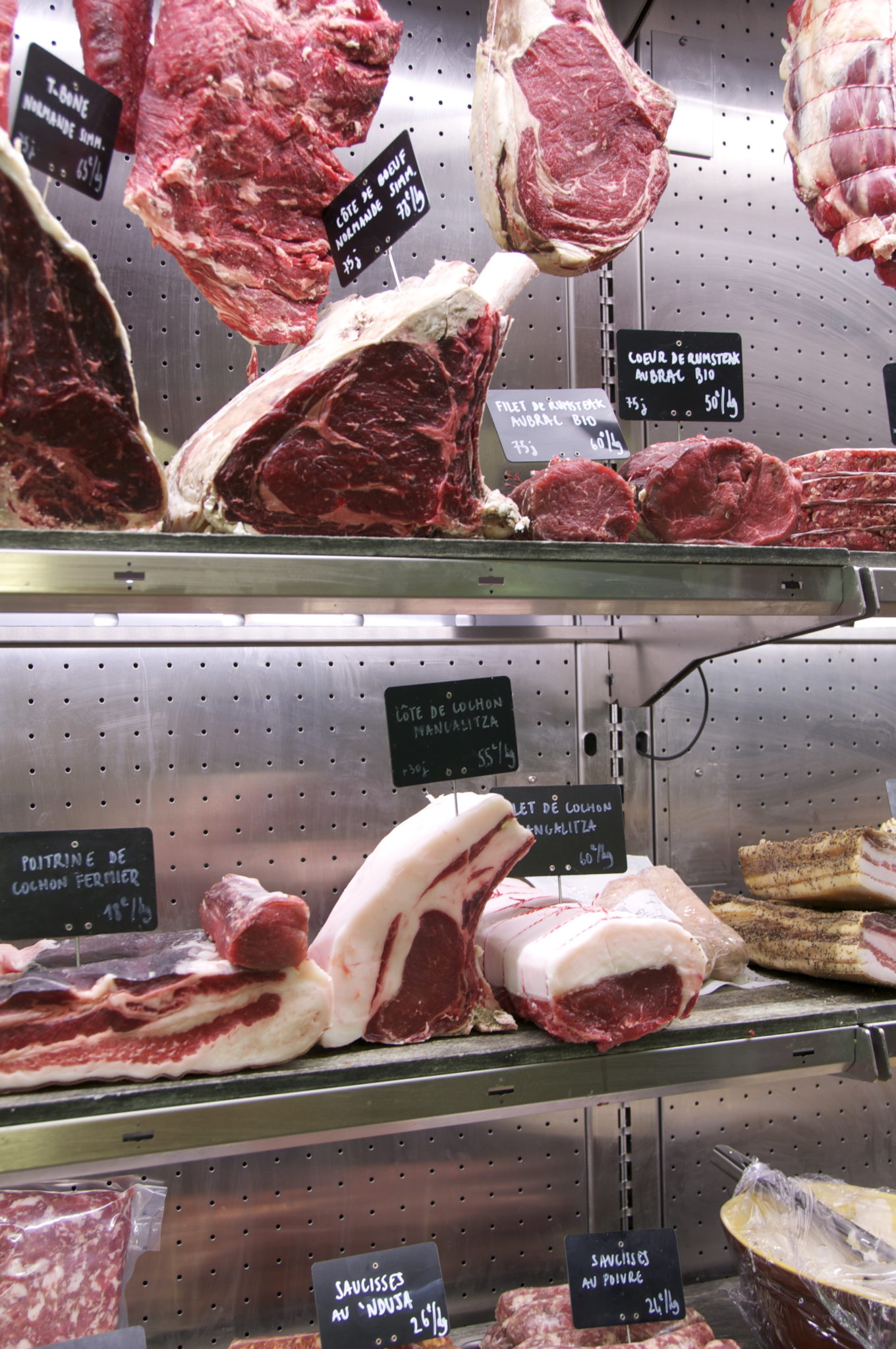 Cette transparence, elle se retrouve jusque dans la conception de la boutique. Depuis le billot qui trône au milieu de l’espace en passant par les vitrines depuis lesquelles les pièces de viandes sont exposées jusqu’à la chambre froide vitrée, qui tel un tableau de Soutine, laisse entrevoir les bêtes en cours de maturation. Commandées entières et désossées sur place avec « une découpe « à la française » qui requiert une grande précision dans le geste » souligne Adrien.